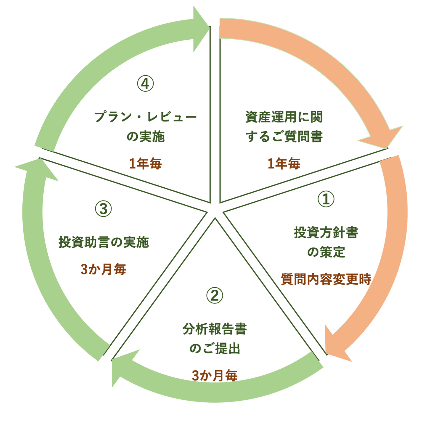お客さまの助言者は、年に1回、投資意向、リスク許容度、資金予定等について変更の有無を確認させてさせて頂き、変更がある場合は投資意向に関する質問書を再度ご記入頂き、投資タイプの変更をいたします。